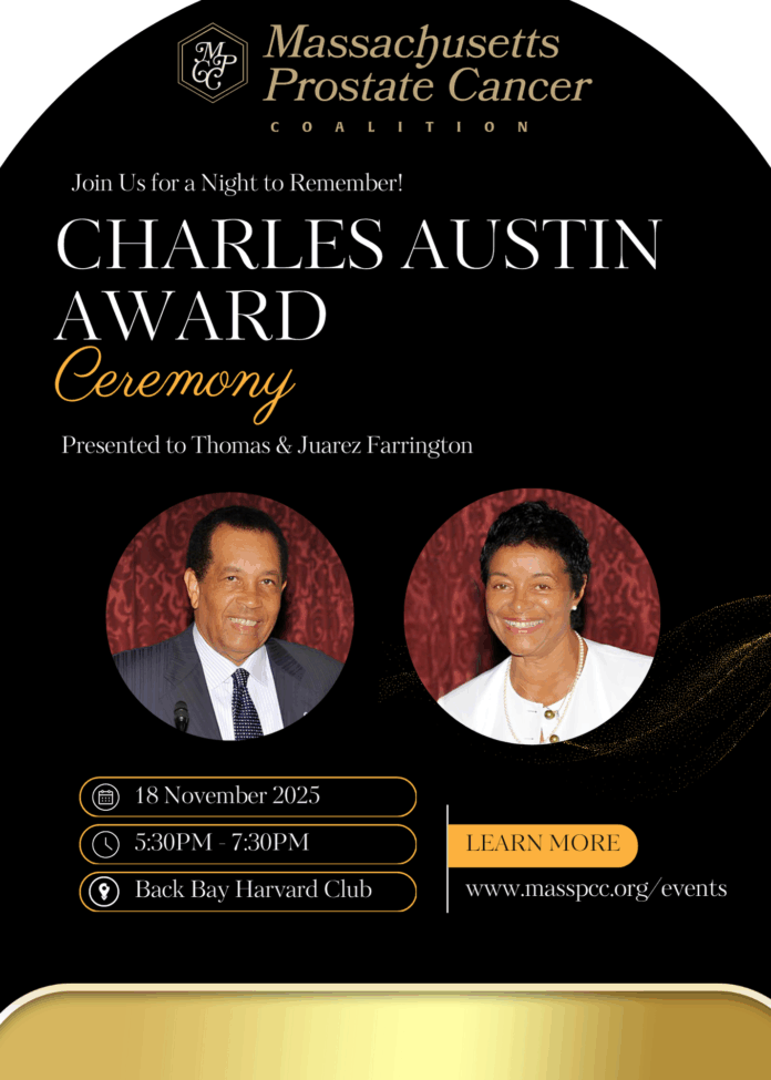 Join us on November 18 in Boston for a night of celebration and recognition! The Massachusetts Prostate Cancer Coalition proudly presents the 2025 Charles Austin Award Ceremony (Back Bay Harvard Club), honoring this year’s recipients, Thomas and Juarez Farrington, for their dedication and impact. The Farringtons are more than well-known in Boston and across the country for their personal efforts and through PHEN, Prostate Health Education Network, an organization founded by Thomas Farrington in 2003. Registration required, seats are limited — MassPCC.org/events/